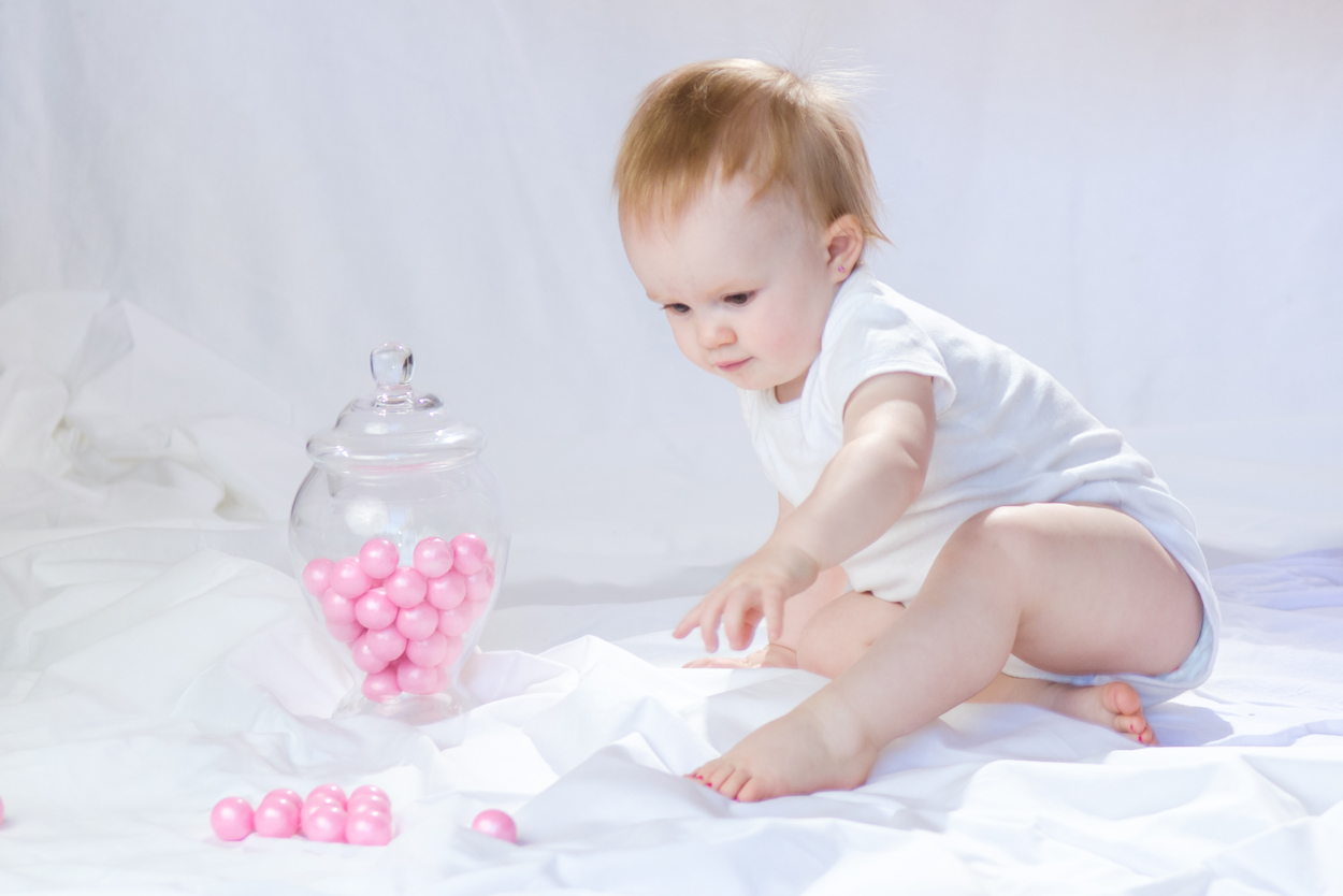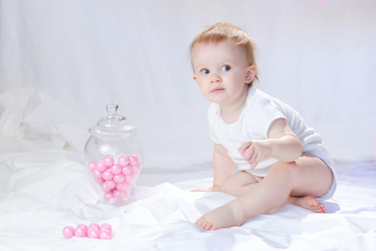 Alix's parents contacted me to go over to their house for a portrait session just before her first birthday. Little did I know that this was going to be a smash-em-up cake event. I was prepared for a tight space and a white backdrop. When I arrived we had props in pink and banners to boot. All carefully crafted by Alix's parents Miranda and Nathanial. Donned only in a white onesie, my charismatic toddler was placed before the camera fresh and clean and expected to perform a sweet and sticky show.