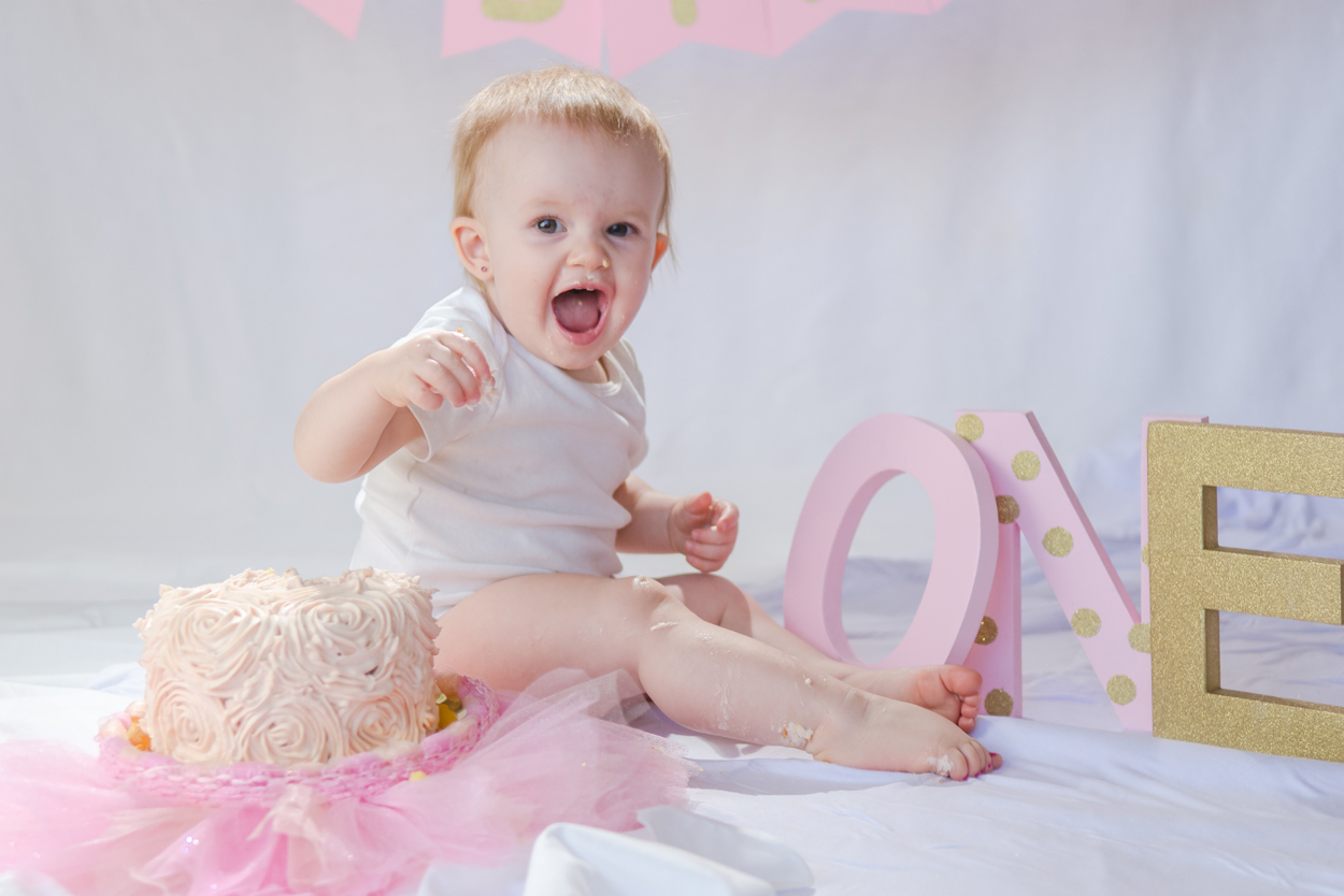 While this one-year-old is humorous, spunky, and smart. A cake smasher, she is not! There was plenty of laughs and curiosity from Alix well enough to have a successful and fun session. However, the lovely pink cake remained largely intact.