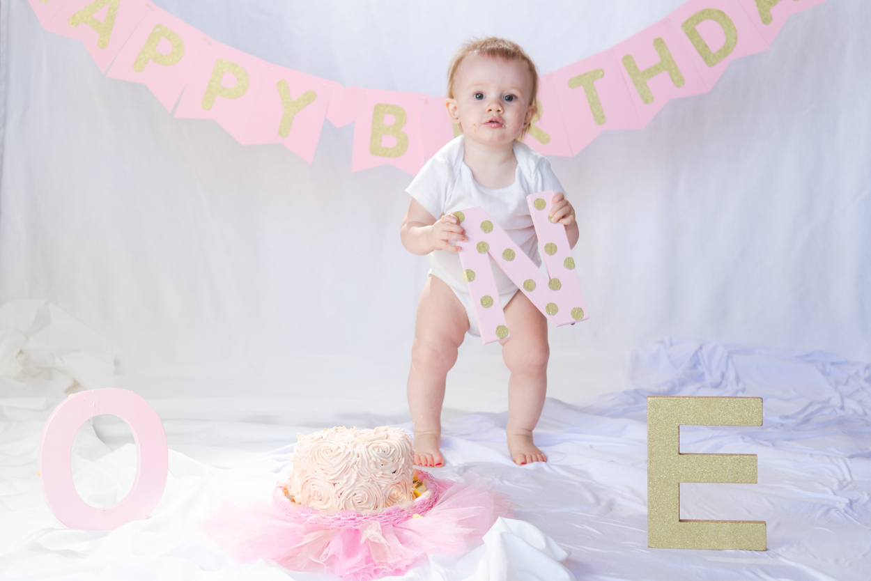 Alix's parents contacted me to go over to their house for a portrait session just before her first birthday. Little did I know that this was going to be a smash-em-up cake event. I was prepared for a tight space and a white backdrop. When I arrived we had props in pink and banners to boot. All carefully crafted by Alix's parents Miranda and Nathanial. Donned only in a white onesie, my charismatic toddler was placed before the camera fresh and clean and expected to perform a sweet and sticky show.