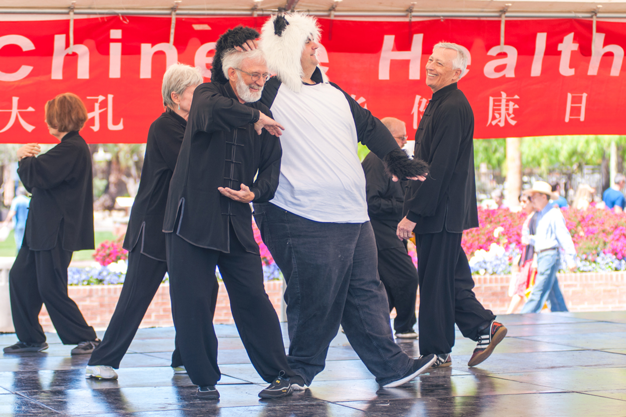 The day was sunny and cheerful, as was the clever performance put on by Wind River. While the Tai Chi practicioners performed various segments of the ancient form, Dai Si Hing, Jason Hurford, playfully acted out the part of a curious panda bear intrigued by the actions of the Tai Chi players. Through his mischevious mirroring and investigations he begins to understand and learns how to follow the principles of Tai Chi Chuan.